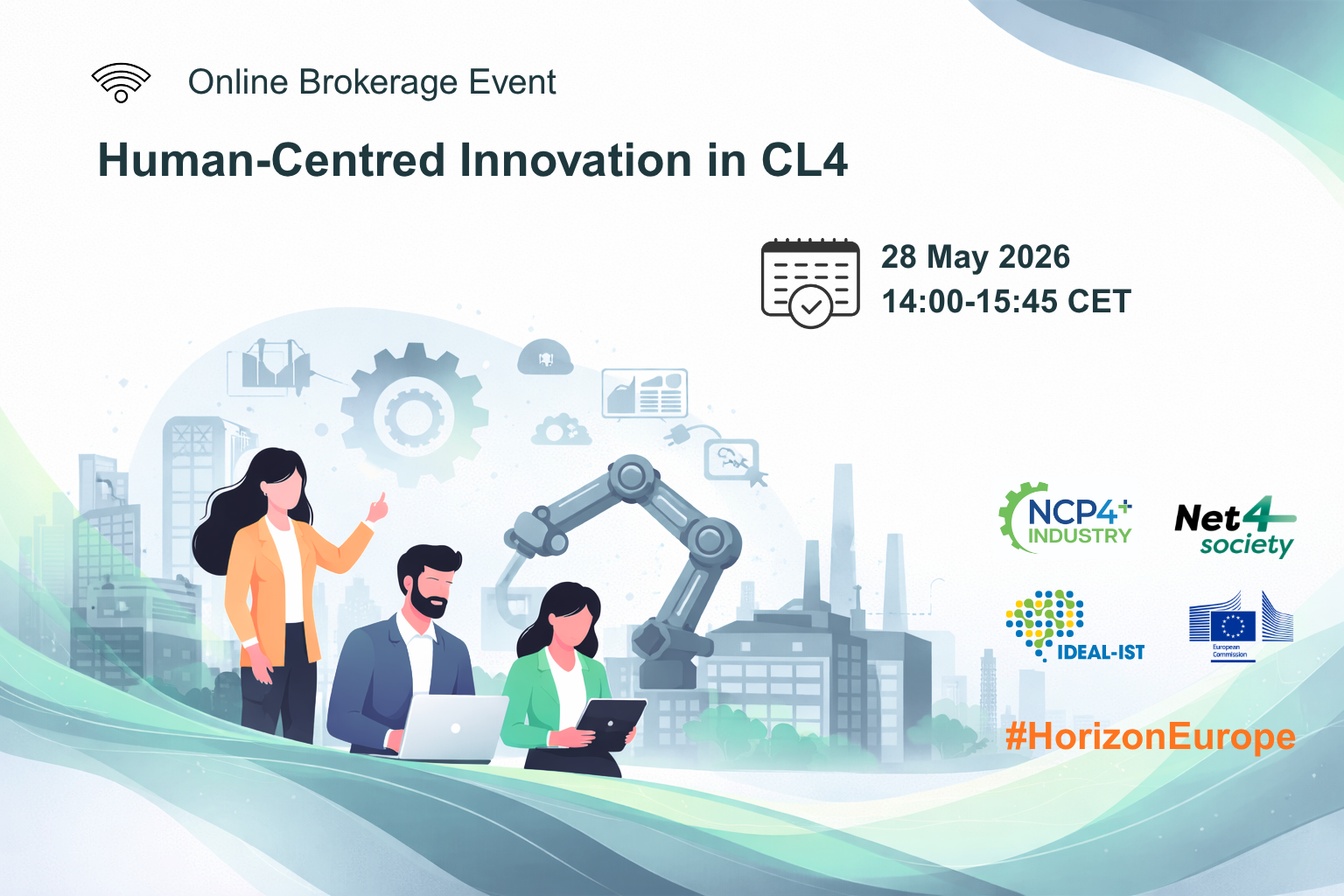 The NCP4Industry network, in collaboration with Ideal-ist 2027 and Net4Society, invites researchers, industry representatives, digital innovators and other stakeholders to join an online brokerage event dedicated to selected upcoming Horizon Europe Cluster 4 (Digital, Industry, Space) calls.